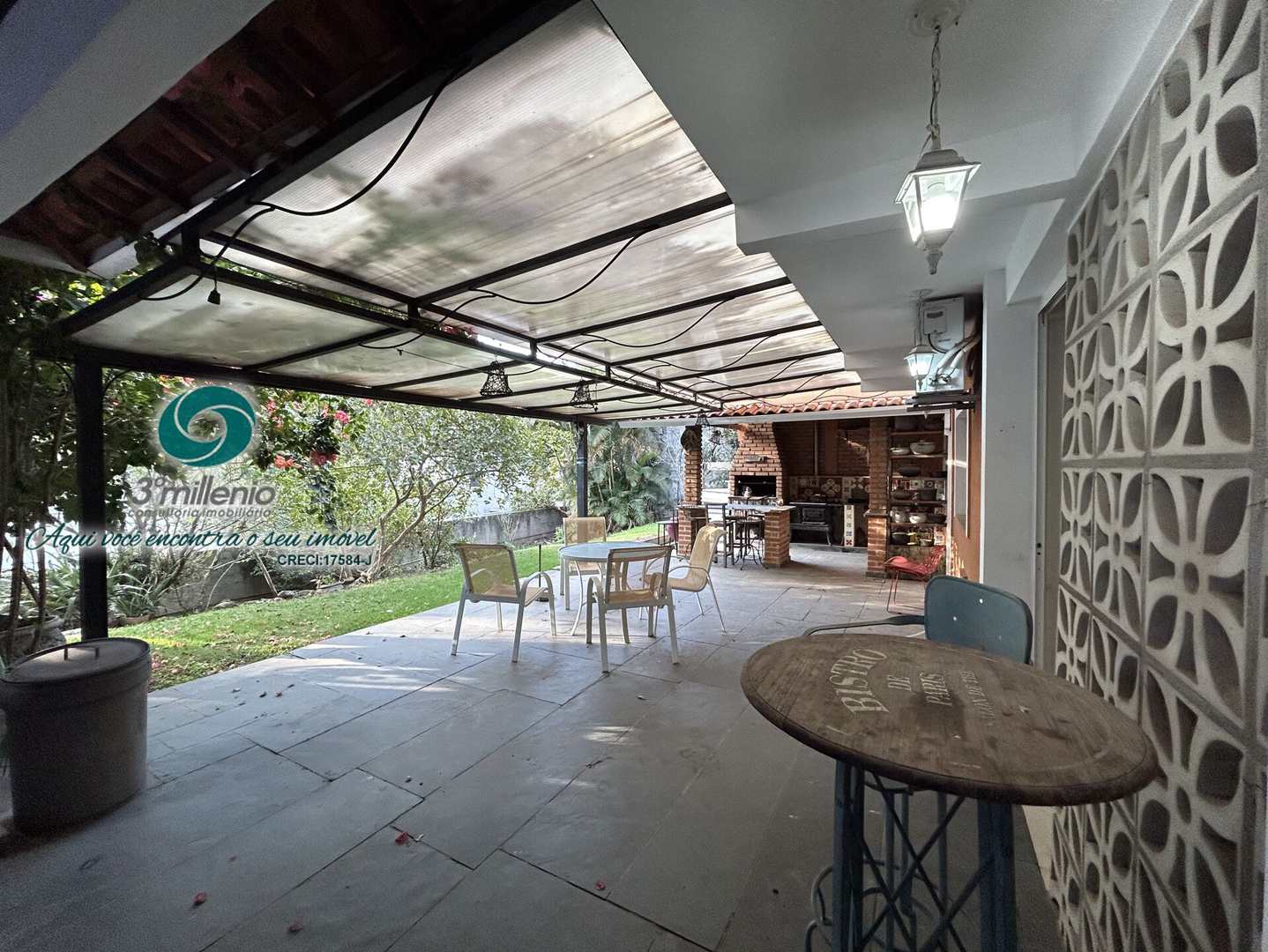 A grande varanda gourmet conta com churrasqueira e vista para o verde do jardim e quintal que conta com orquidário, pomar e oficina.