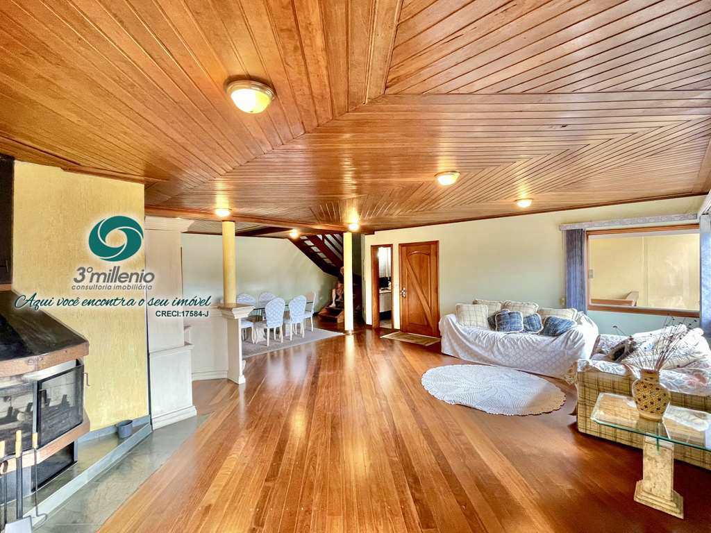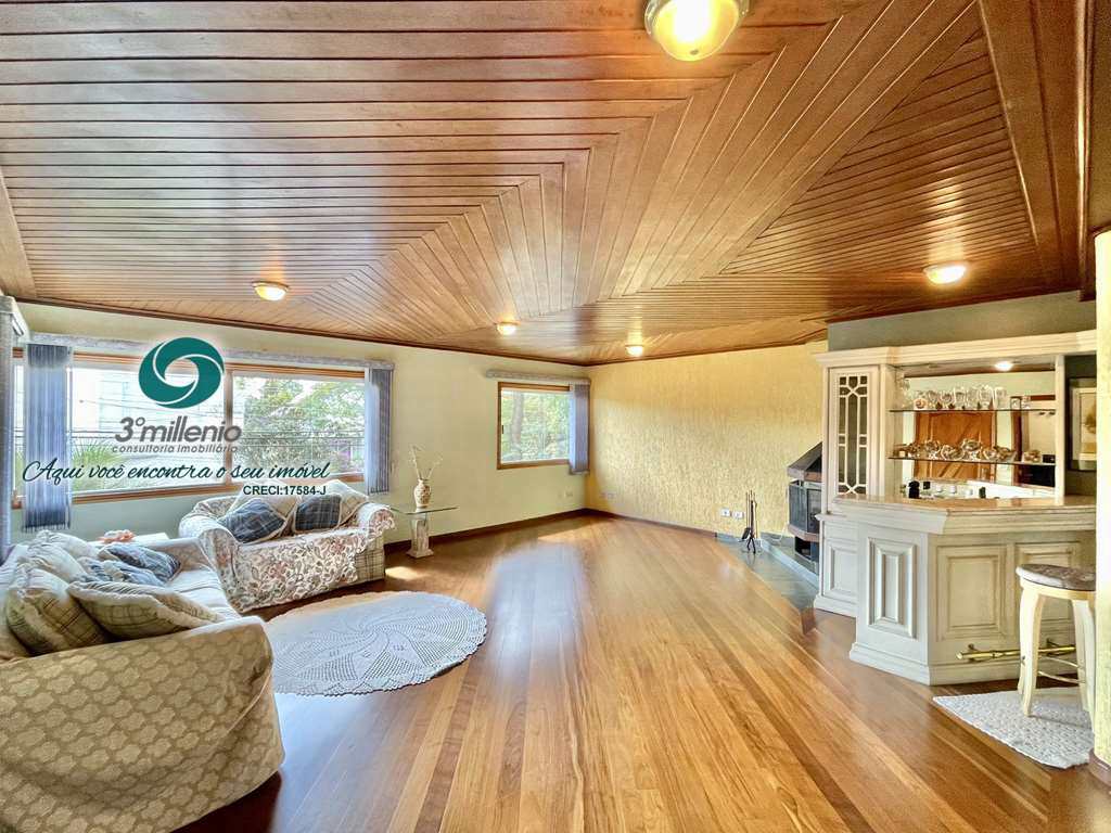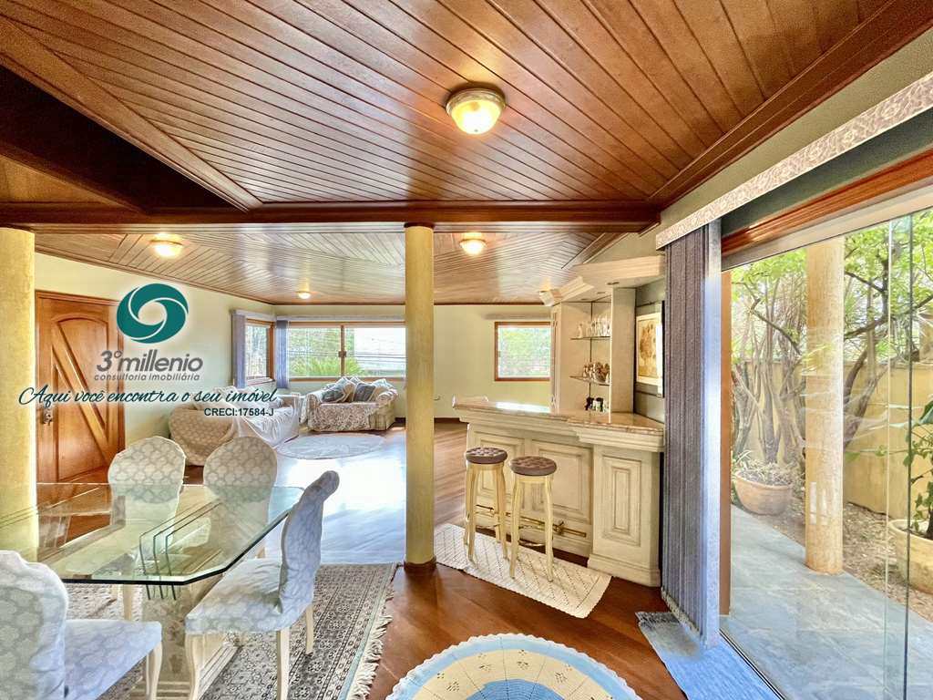 Estar, lareira/TV, bar e jantar integrada à cozinha.