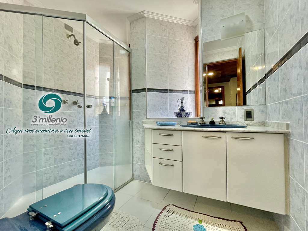 Banheiros com espelho, bancada em mármore, armário, gabinetes e box de vidro, sendo a master com hidro.